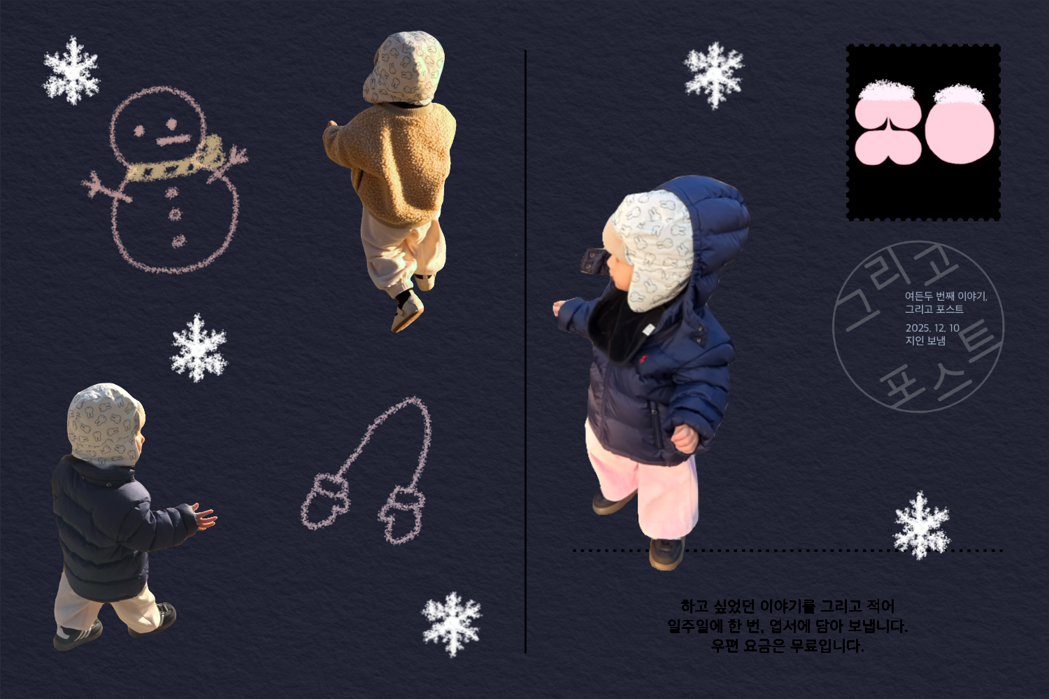 ์ด ํจ๊ป ๋จน๋ ์ฒซ ๊ฒจ์ธ ๊ฐ์. ์ด๋ ๊ฒ ๋ ๋ณ๊ฑฐ ์๋ ๊ฒ์ ์๋ฏธ๋ฅผ ๋ถ์ด๋ฃ๊ณ , ํน๋ณํ ์๊ฐ์ด๋ผ ์๊ฒจ๋์๋ค.