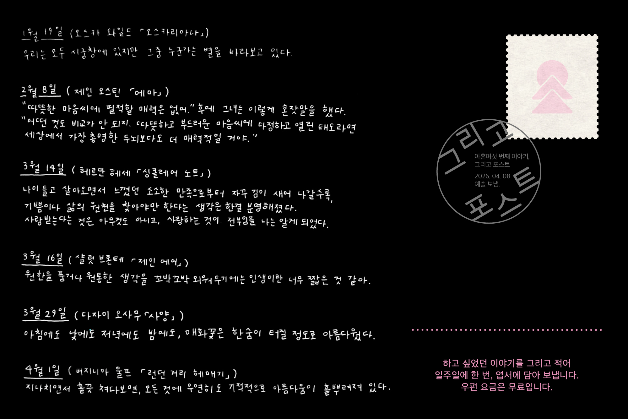 ์ ๋ง์์ ์ธ๋ฆฐ ๋ฌธ์ฅ๋ค ์ค ์ผ๋ถ๋ ๋งจ ์ ์ด๋ฏธ์ง์ ์ ์ด๋์์ด์. ์์ฆ์ ํฉ๋ ๋ฆฌ๋ ๋ฒ๊ฝ๊ณผ ํจ๊ป, '๋ชจ๋ ๊ฒ์ ์ฐ์ฐํ๋ ๊ธฐ์ ์ ์ผ๋ก ์๋ฆ๋ค์์ด ํฉ๋ฟ๋ ค์ ธ์๋ค'๋ 4์ 1์ผ์ ๋ฌธ์ฅ์ ํ๊ณ ๋ค๋๋๋ค. ์ด ๋ญ๋ง๋ํด๋ฅผ ํจ๊ป ํ๋ฅํ๊ณ ์ถ์ ๋ถ๋ค์ ํ๋ฒ์ฉ ์ฝ์ด๋ณด์ธ์! ์ฌ๋ฌ๋ถ์ ๋ง์์ ํ